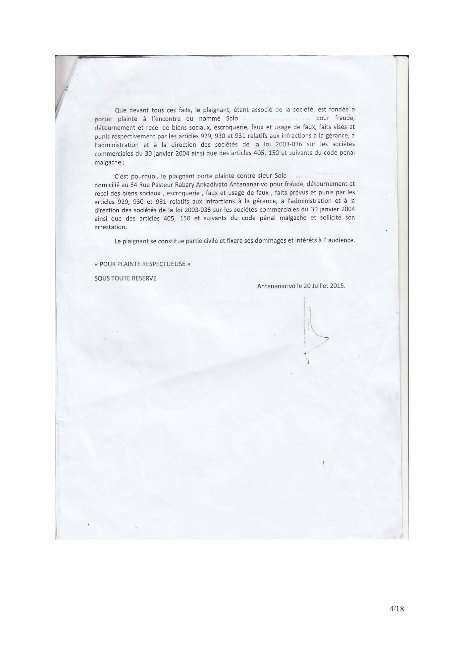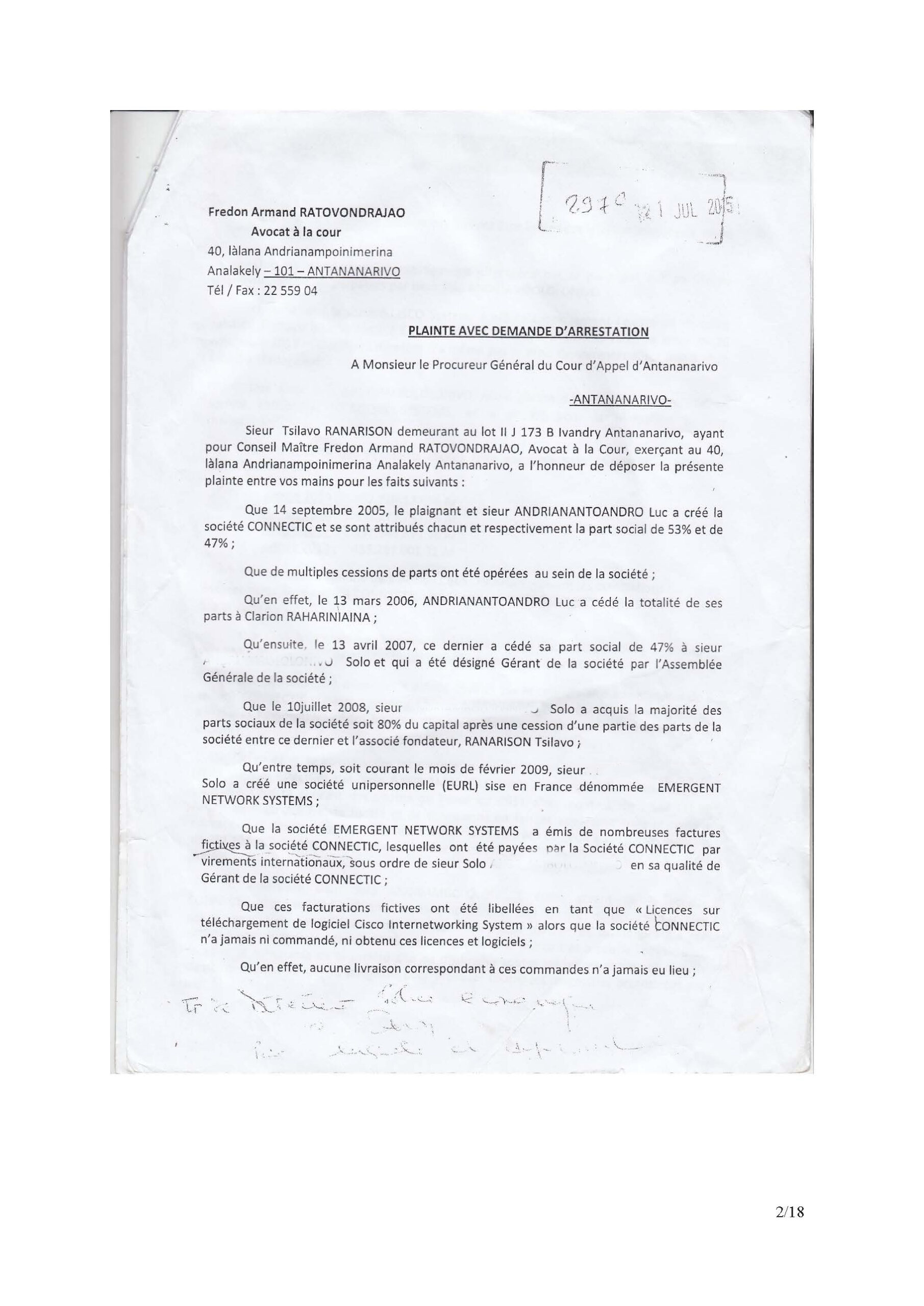 La justice malgache a été manipulée par RANARISON Tsilavo pour faire condamner Solo, son patron, à 2 ans de prison avec sursis et 428.492 euros d’intérêts civils à régler à RANARISON Tsilavo, un simple associé, alors que c’est la société CONNECTIC qui est la victime directe et personnelle