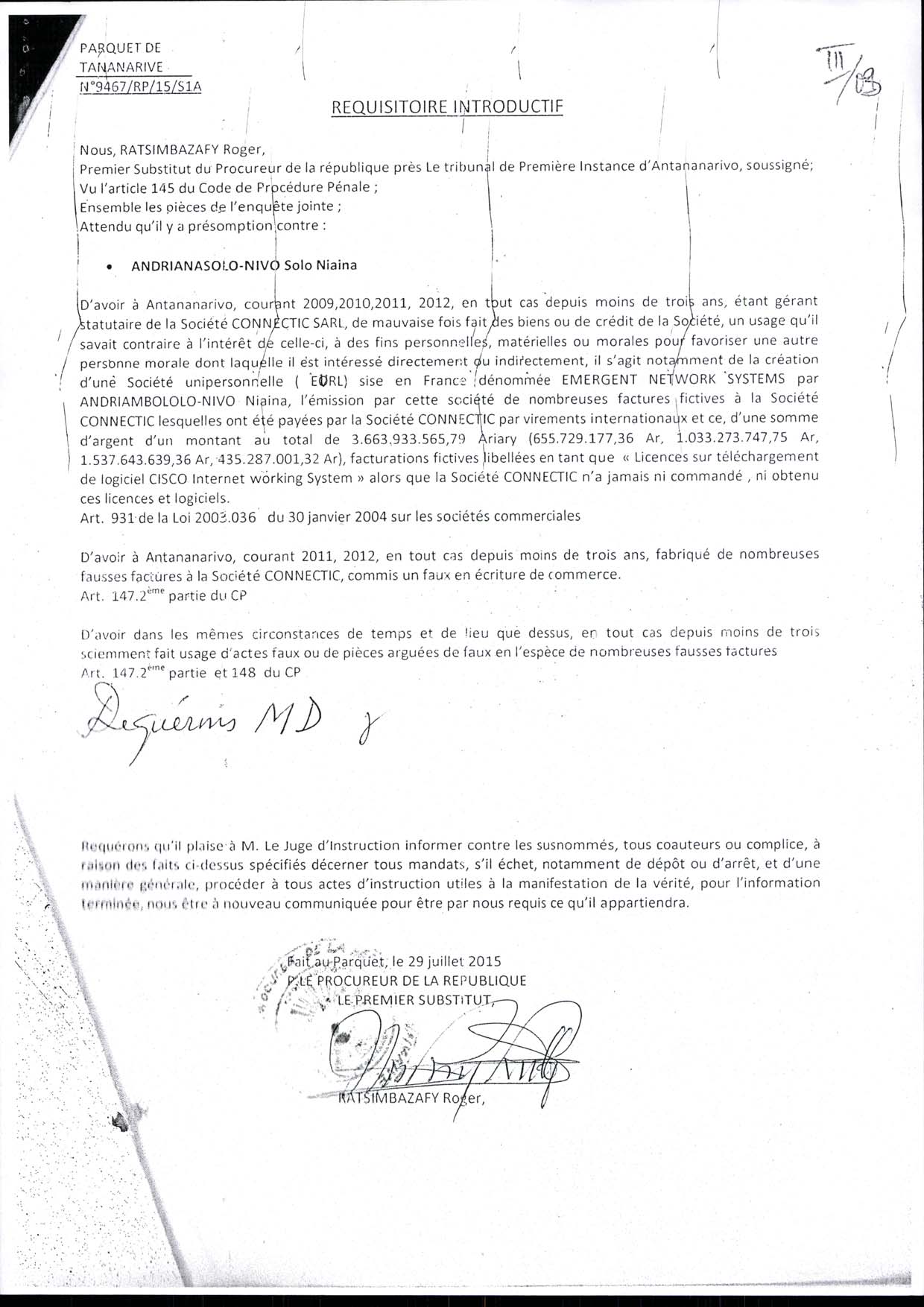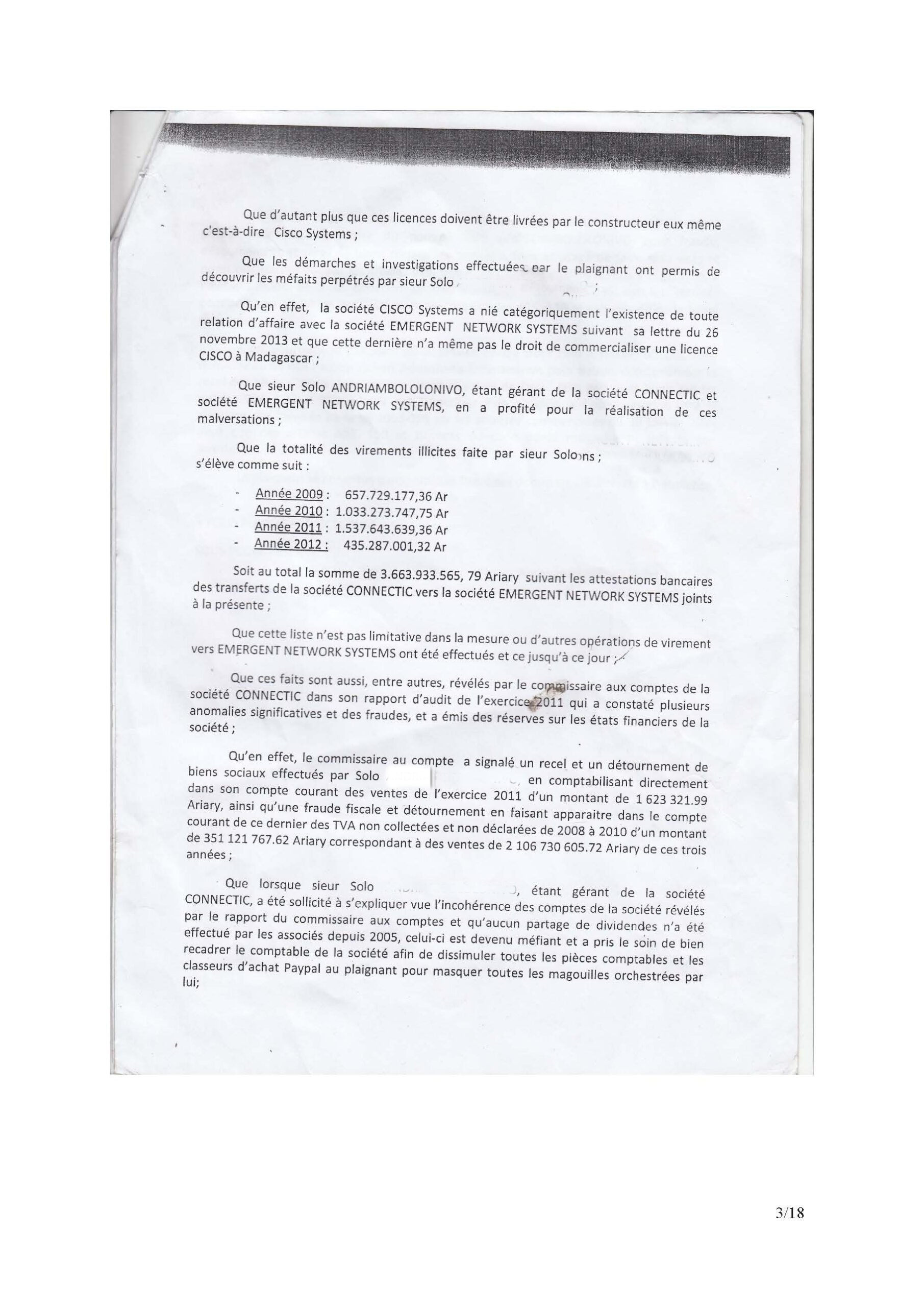 « Monsieur ANDRIAMBOLOLO-NIVO, en sa qualité de gérant de la société CONNECTIC, payait les factures d’EMERGENT NETWORK SYSTEMS, pour un montant total de 3.663.933.565, 79 ariary, soit environ 1.047.060 euros. »