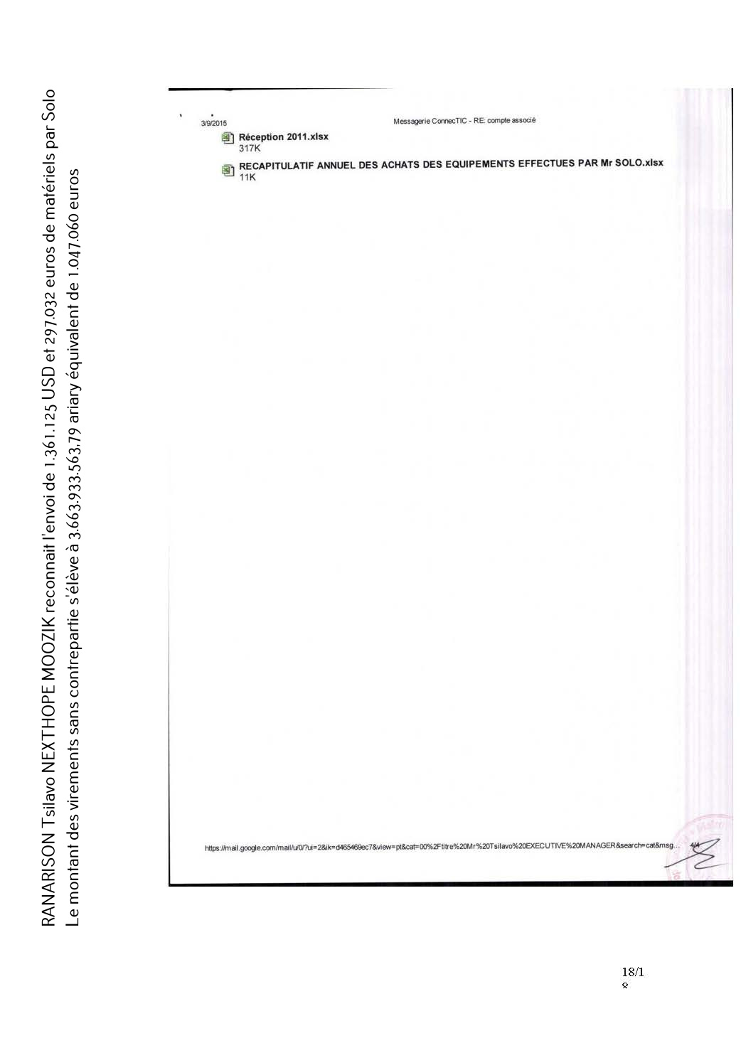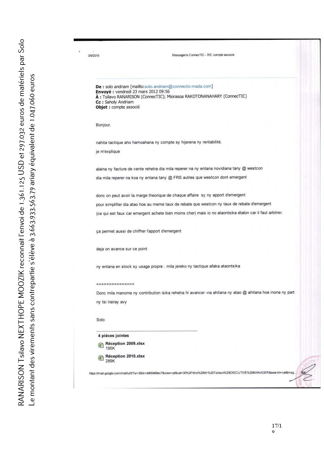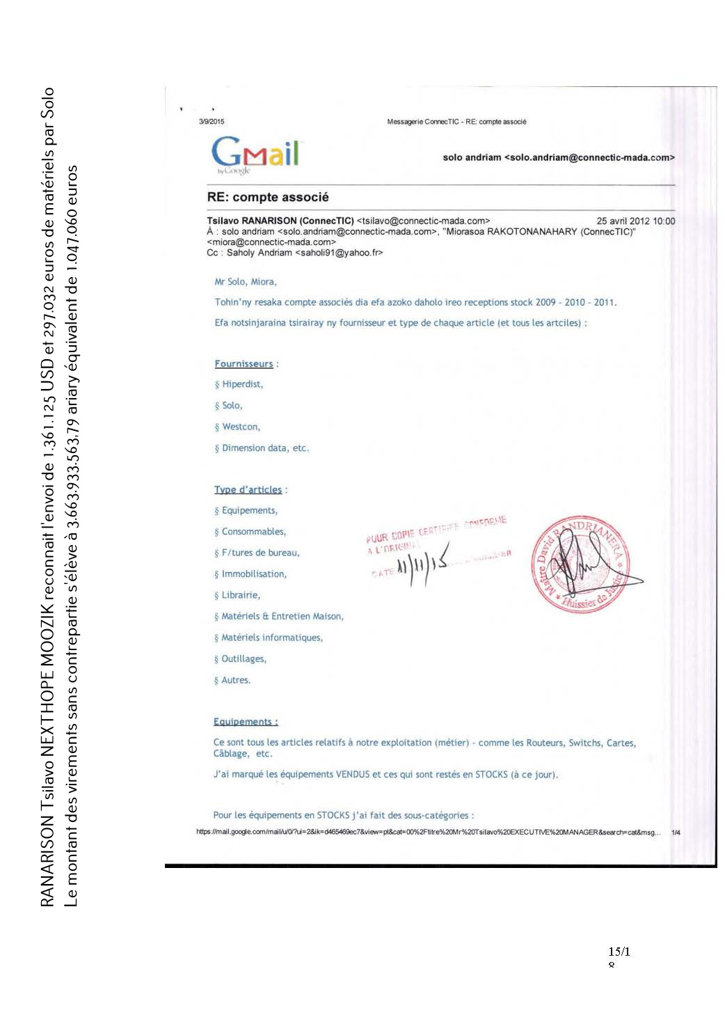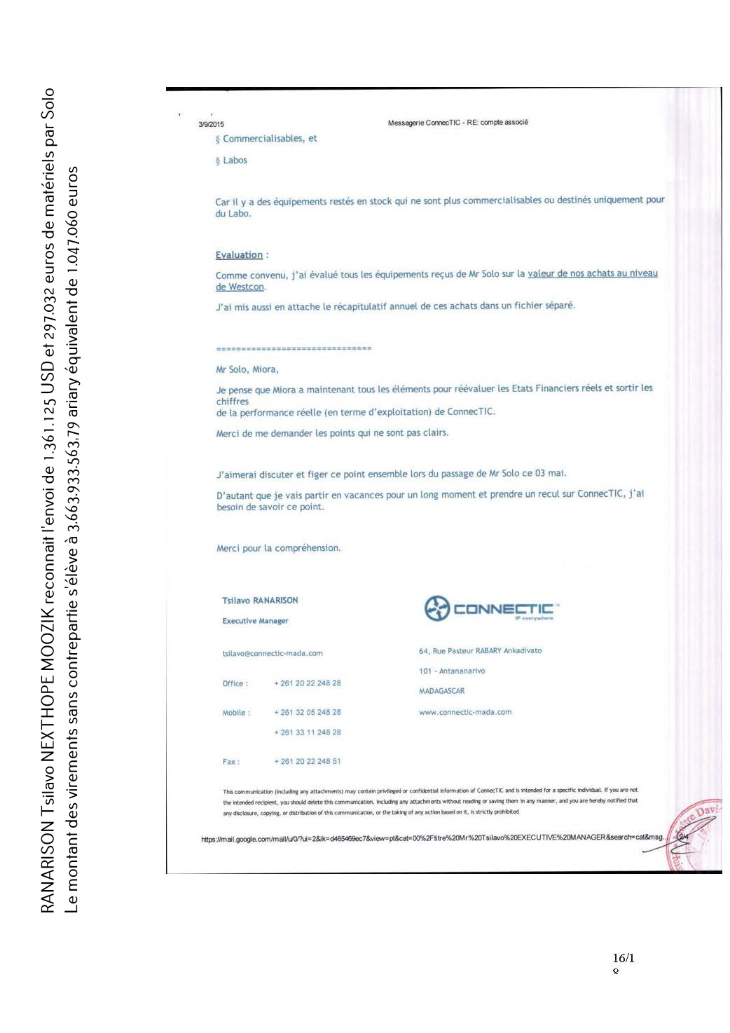 Les virements de 1.047.060 euros, objet de la plainte pour abus de biens sociaux de RANARISON Tsilavo, tous les ordres de virement signés par RANARISON Tsilavo, ont une contrepartie de 1.321.125 USD et 297.032 EUROS de matériels reçus par CONNECTIC d’après l’email du 25 avril 2012 de RANARISON Tsilavo lui-même