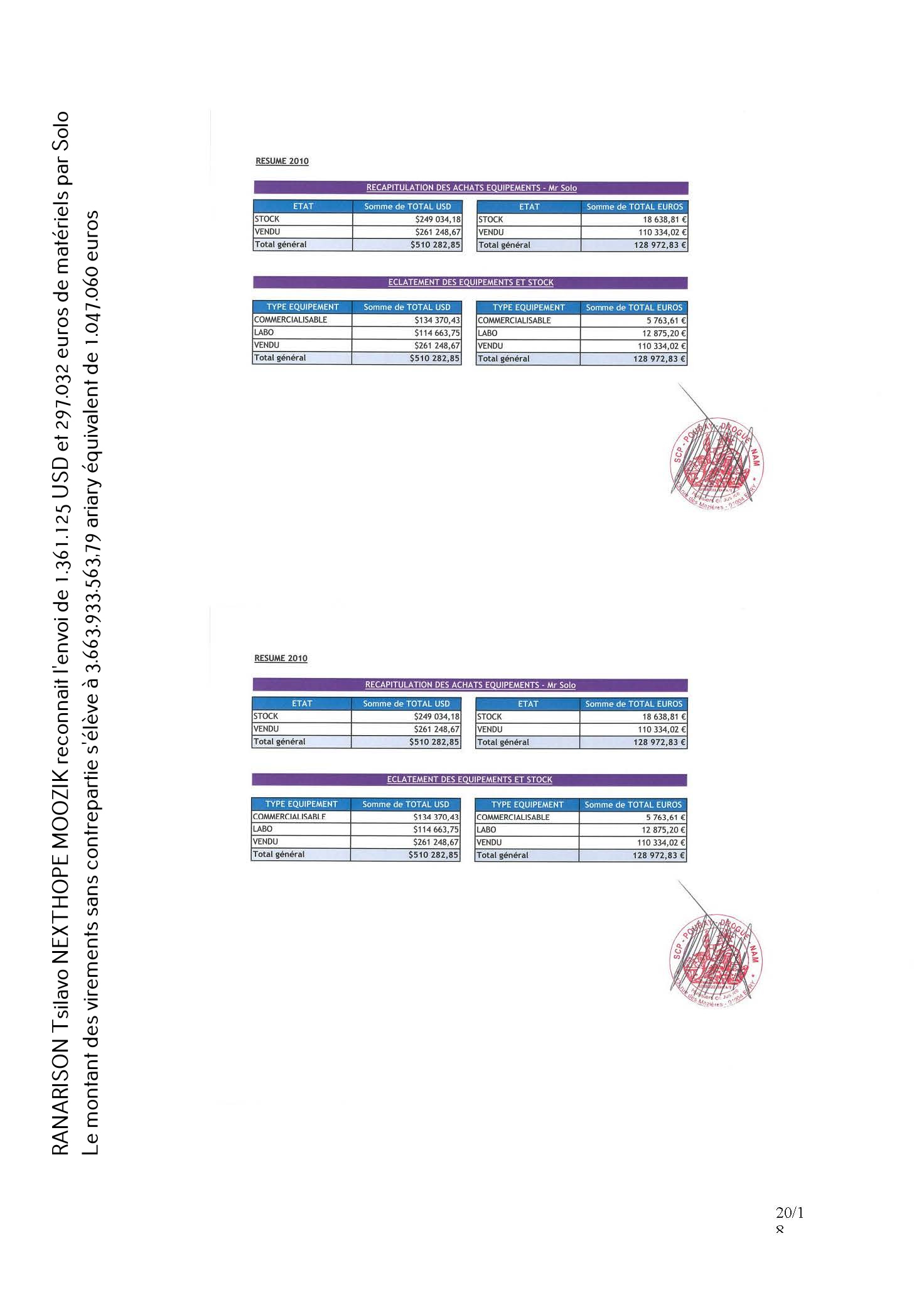 En fait, RANARISON Tsilavo reconnaît lui même le 25 avril 2012, l’envoi par Solo de 1.361.125 USD et 297.032 euros de matériels en contrepartie des virements .