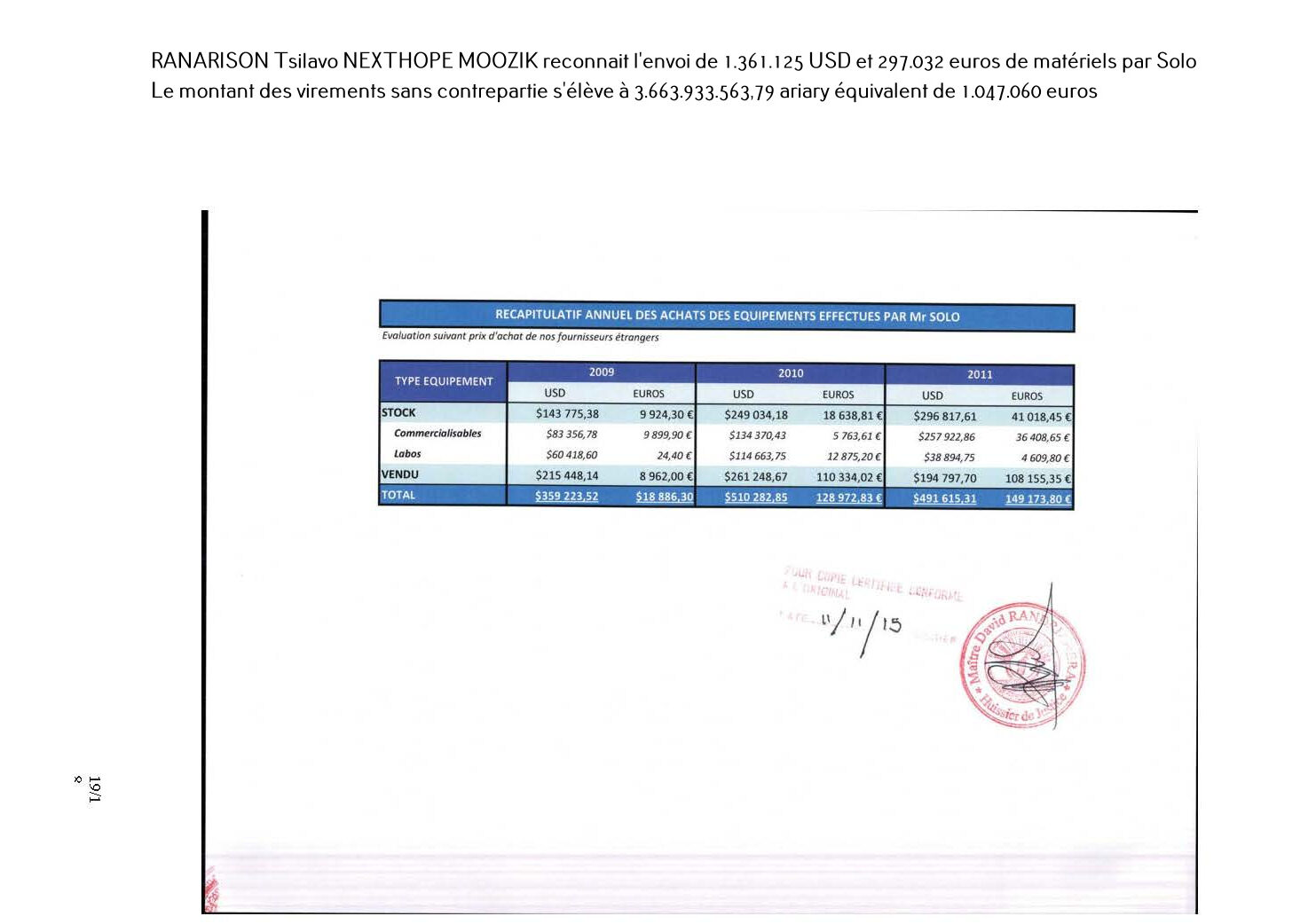 Le récapitulatif annuel des achats des équipements effectués par Mr Solo est un fichier joint de l’email de RANARISON Tsilavo du 25 avril 2012, certifié par des huissiers à Madagascar et en France.